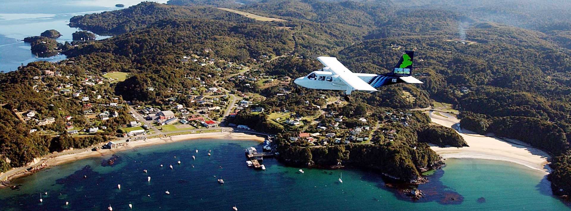 Stewart Island Flights operates 3 daily flights from Invercargill to Stewart Island year round, with fares starting at $NZD122.50 one way per adult, and several packages available including an Ulva Island water taxi, or Mason Bay package, with Rakiura Water Taxi. The views are stunning on the 20 minute flight into Halfmoon Bay.